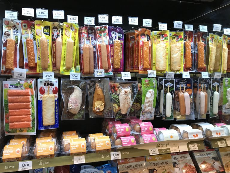 Voici un mix de saucisses et autres spécialités de poisson que l’on trouve dans quasi tous les magasins alimentaires – tout est sous plastique thermo-collé qui n’est pas du meilleur effet…
